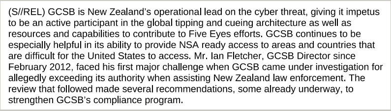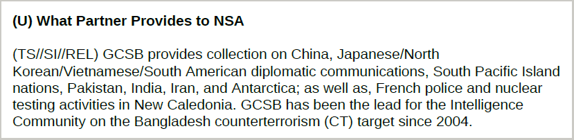 A 2013 NSA document showed China at the top of a list of targets it was having monitored by the GCSB, saying the New Zealand agency gave the NSA "access to areas and countries that are difficult for the United States to access".