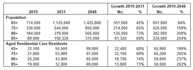 *Source: Statistics NZ population projections by age, NZACA projections of Aged Residential Care residents based on TAS Quarterly Bed Survey and Aged Care Demand Planner and Statistics NZ population projections