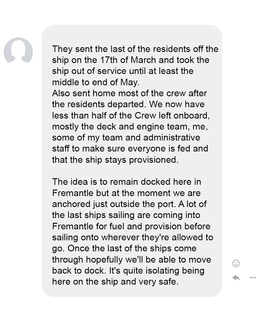 Spoke to another friend via messenger who is the executive chef for The World residents cruise ship that's currently stuck off Fremantle, Australia. He wrote: