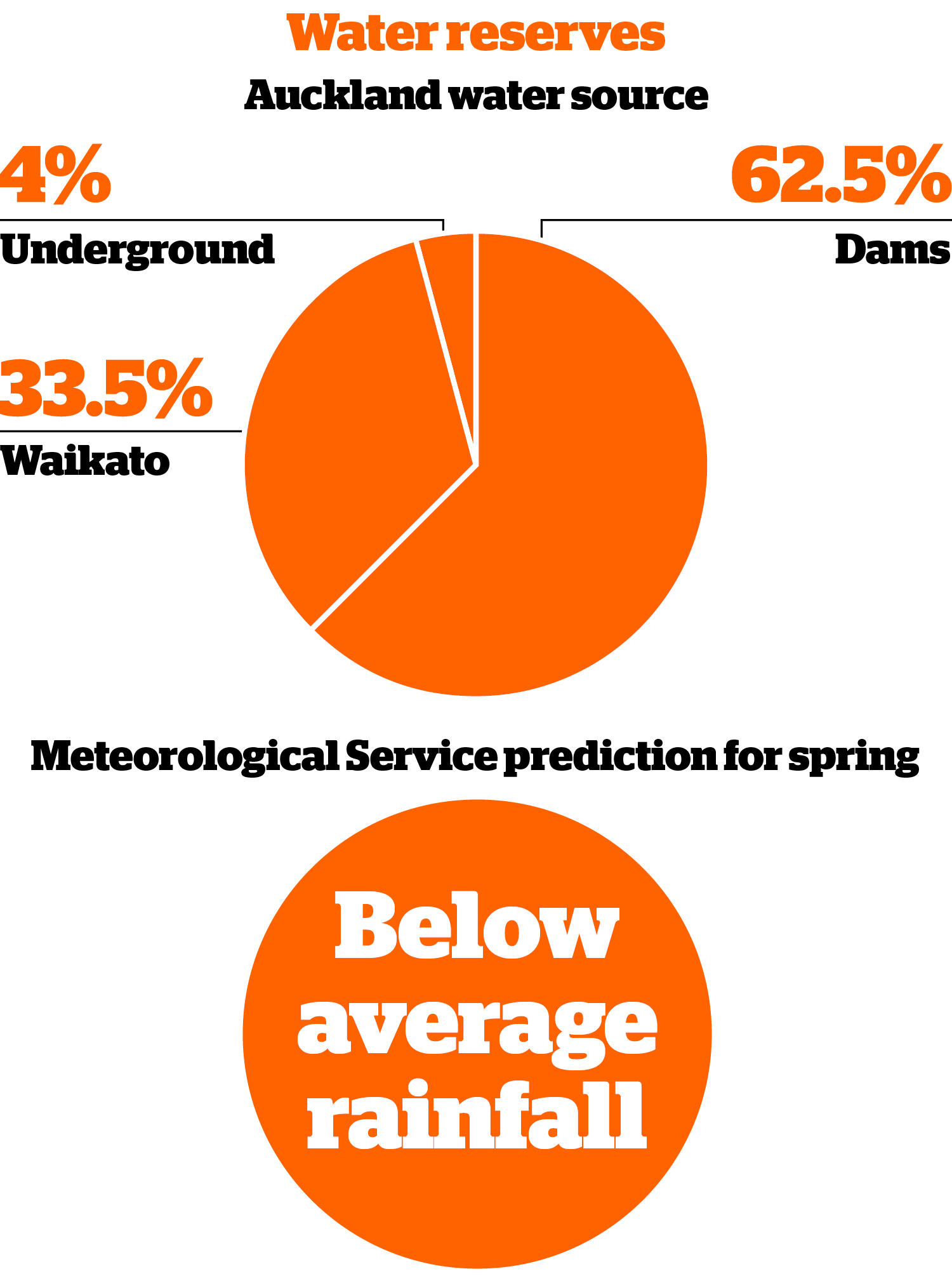 Watercare stores close to two-thirds of its water in reservoirs, or dams. A small amount comes from underground sources (aquifers) and the remaining third comes from the Waikato River. Currently, the dams are 43 per cent full. At this time of year, they should be at 77 per cent.