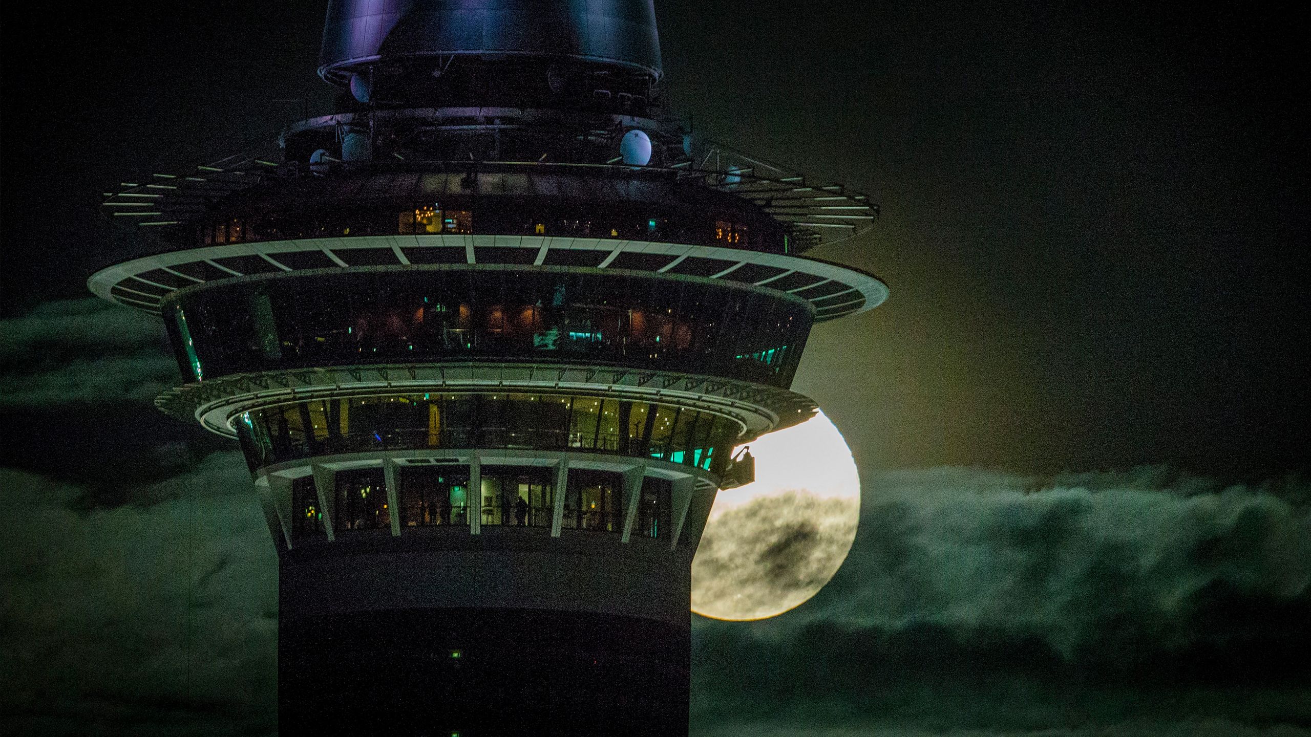 Visitors up Auckland's Sky Tower get a good view of the full moon rising over east Auckland on the eve of the winter solstice. Photo / Jason Oxenham