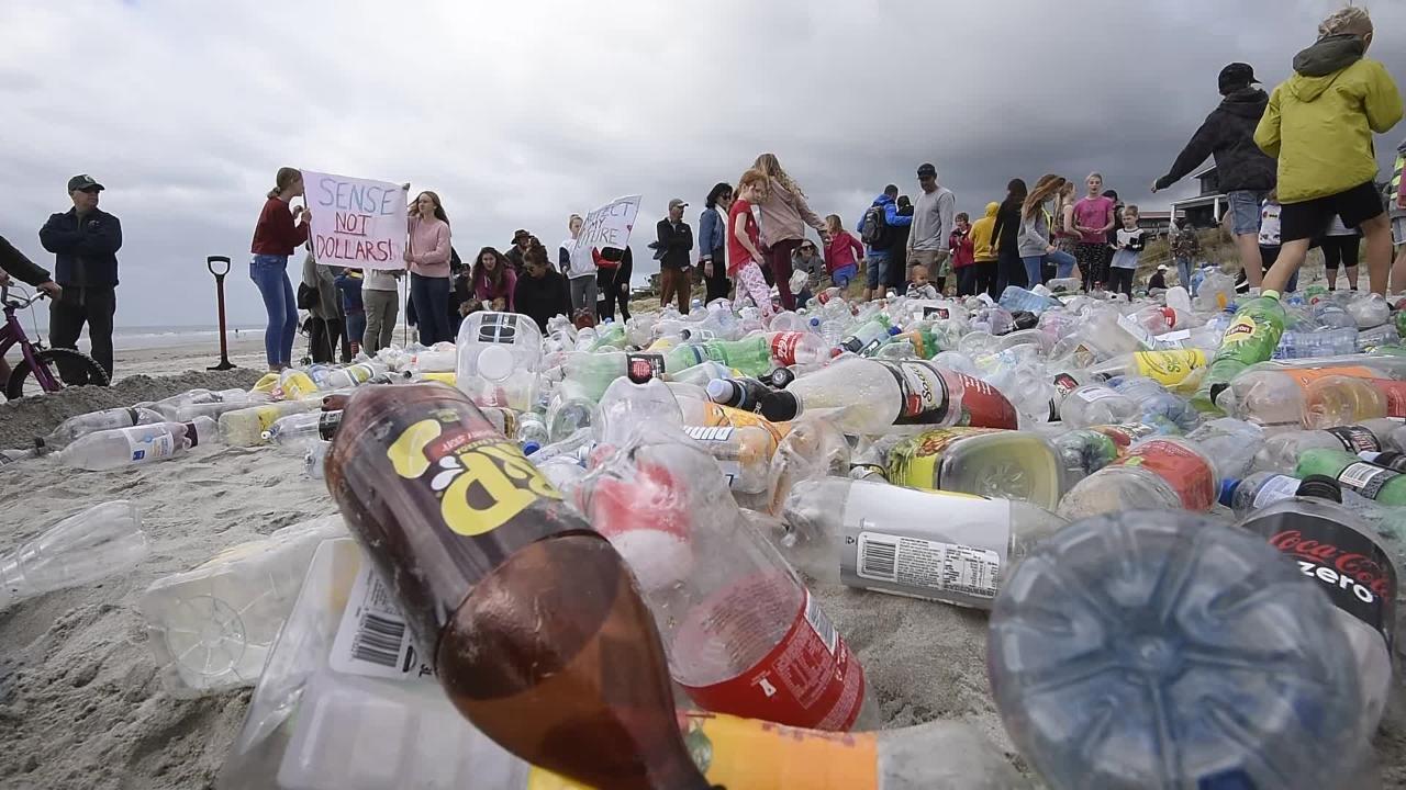 Protesters made a mound of empty plastic bottles in thesand.